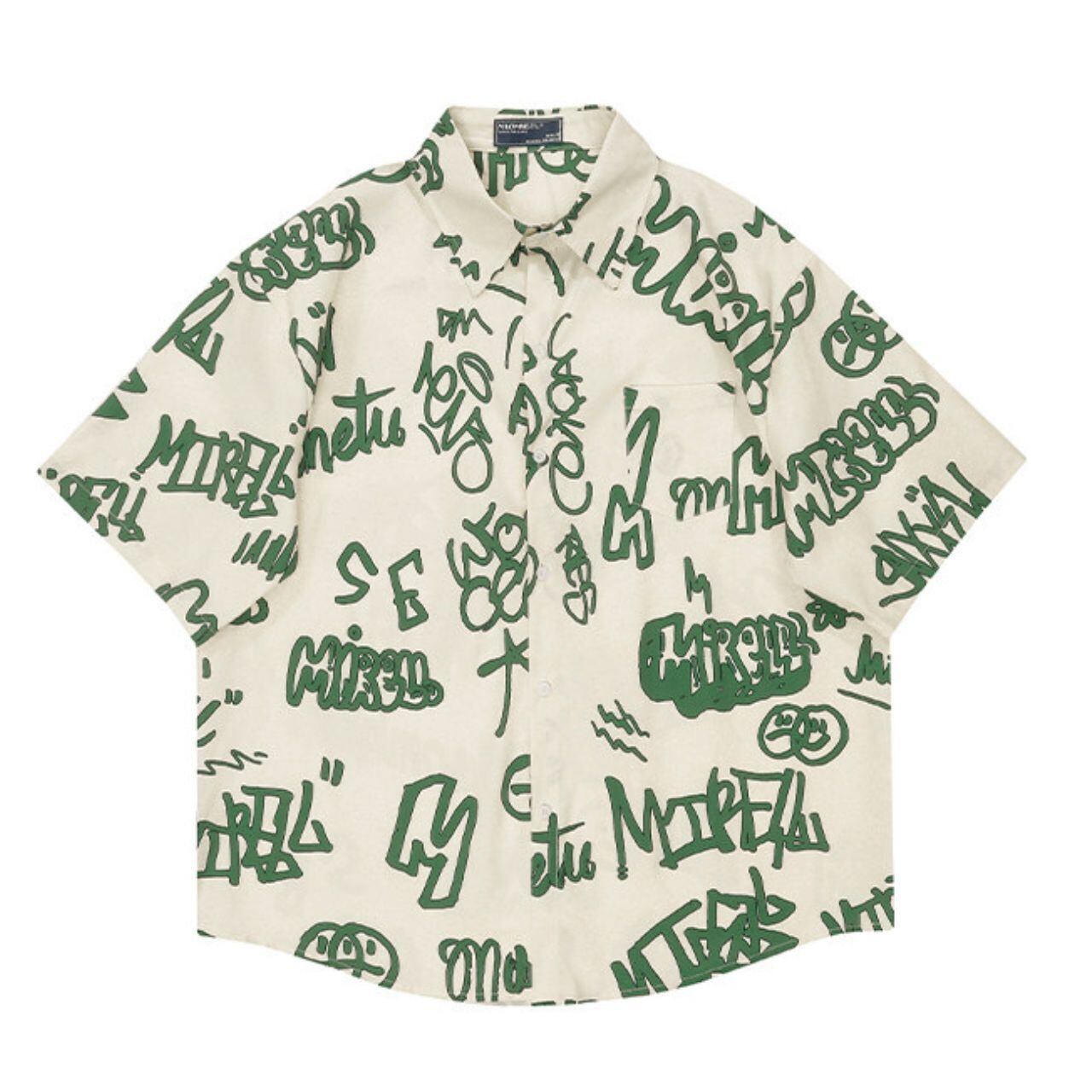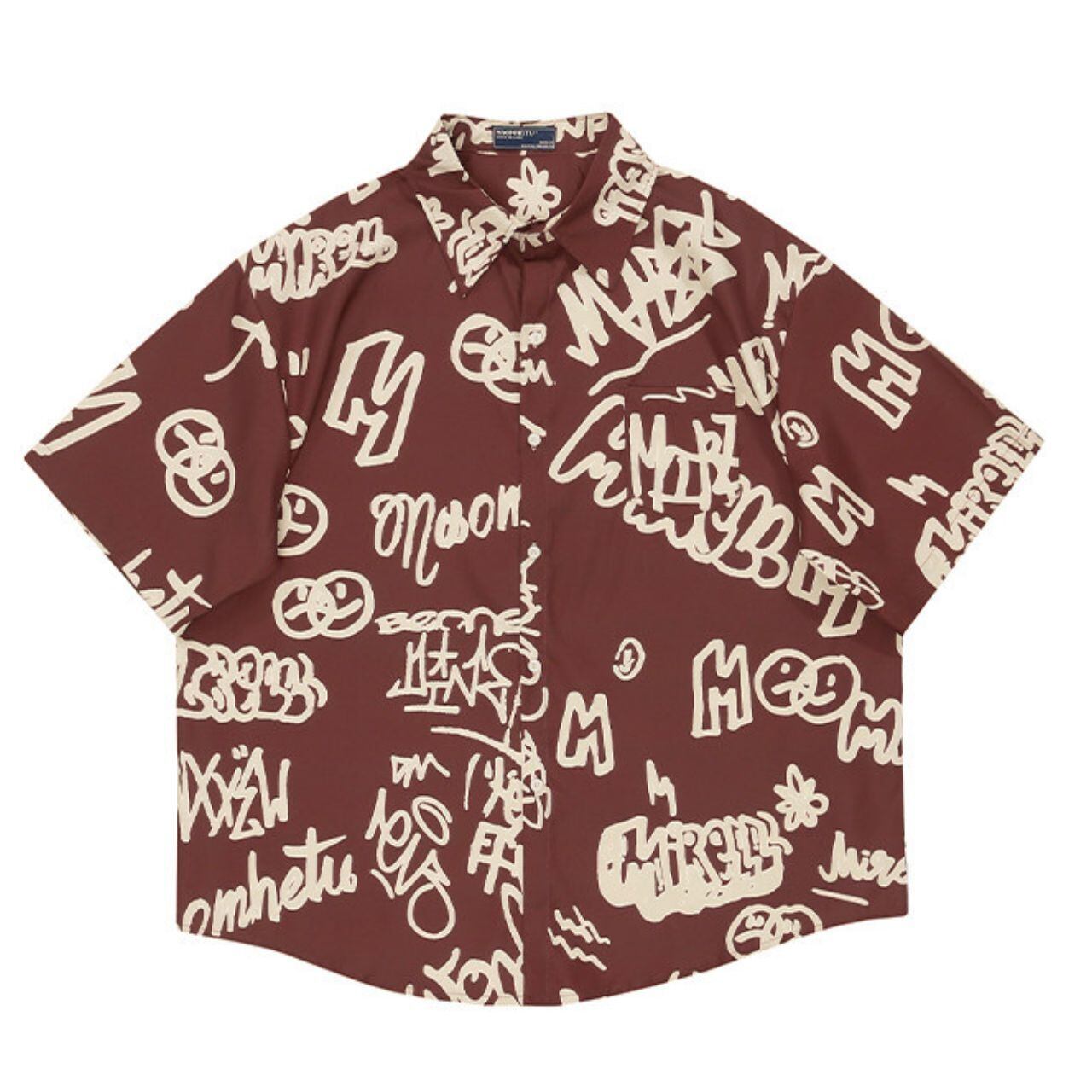 グラフィティ調の総柄プリントが印象的な、オープンカラーの半袖シャツ。